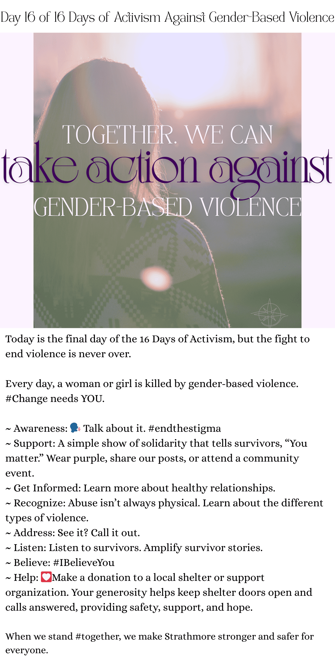 Share a message of solidarity using #16Days and tag @TrueNorthSociety (Facebook) and @True_North_AB (Instagram)