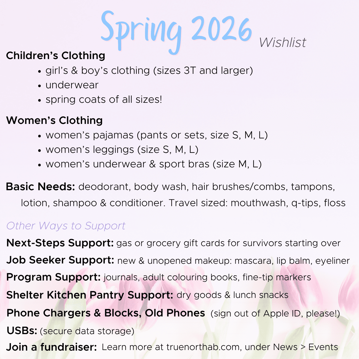 If you would like to support True North with any of these items, please email general@truenorthab.com or call 403-934-6634 ext. 0 anytime for details on how to donate.